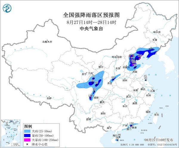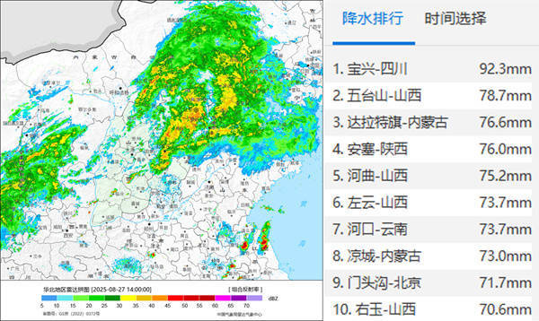 8月27日14时雷达回波图及昨天14时至今天14时全国降水排行。(来源:中央气象台)